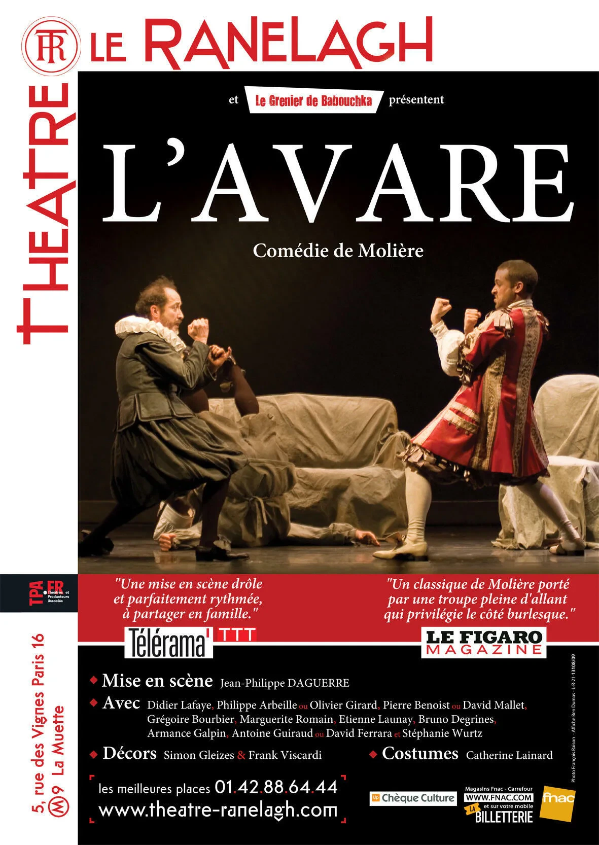 In addition to the jubilant psychiatric analysis of avarice through the character of Harpagon and the formidable exposition of the generational conflict, the play is distinguished by a theatrical profusion that blends love and family intrigues in a style in which Molière revels in bringing together the natural language of Harpagon and the more sophisticated language of the other characters.